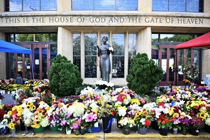 Se ven flores el 3 de septiembre de 2025, afuera de la Iglesia Católica de la Anunciación en Minneapolis, donde un tirador mató a dos niños e hirió a otras 21 personas el 27 de agosto de 2025. | Se ven flores el 3 de septiembre de 2025, afuera de la Iglesia Católica de la Anunciación en Minneapolis, donde un tirador mató a dos niños e hirió a otras 21 personas el 27 de agosto de 2025. | Crédito: Alex Wroblewski/Getty