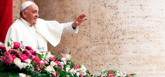 (fOTO: Un retrato del Papa Francisco se observa mientras el Arzobispo José H. Gomez celebra..