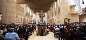 Mons. Cabrera junto a otros fieles a los pies de la imagen de Cristo Rey..
