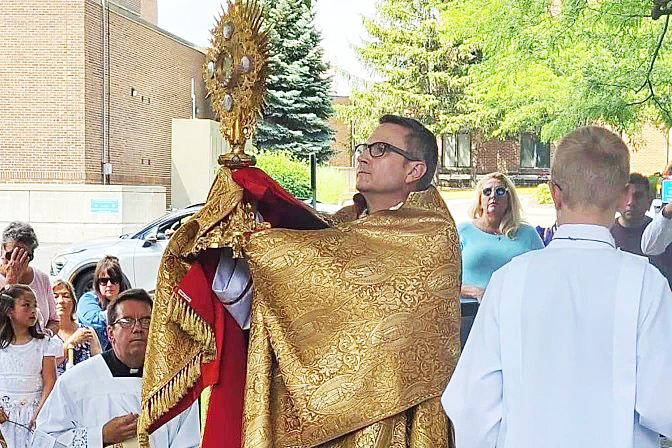 El obispo Ronald Hicks encabeza una procesión en mayo de 2025 en la Diócesis de Joliet como parte de la Peregrinación Eucarística Nacional. | Crédito: Trevor Alcorn.