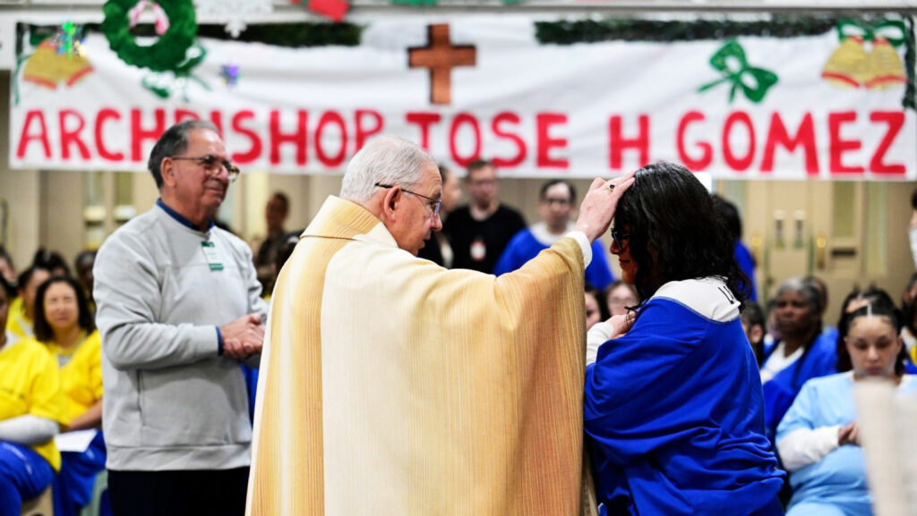 (fOTO: El Arzobispo José H. Gomez bendice a una reclusa en el Centro Regional de Detención Century, la cárcel de mujeres más grande del condado de Los Ángeles, durante la Misa de Navidad el 25 de diciembre de 2025. | John McCoy)
