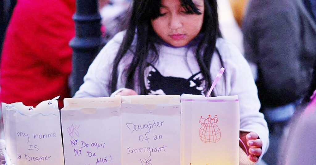 (fOTO: Zuanny, de ocho años, coloca luminarias con mensajes sobre su madre, una “soñadora” del programa DACA, sobre ella misma y sobre sus hermanas durante una vigilia en La Colaborativa, en Chelsea, Massachusetts, el 10 de octubre de 2025, en apoyo a la comunidad afectada por las redadas y detenciones del Servicio de Inmigración y Control de Aduanas. | OSV News/Brian Snyder, Reuters)