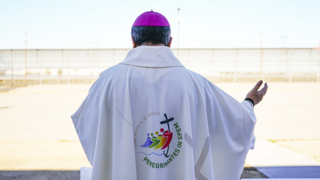 Con copones de Comunión en las manos, un grupo de obispos de California atravesó las puertas de alambre de púas del Centro de Procesamiento del ICE y ofreció a Jesús a los hombres recluidos en su interior.