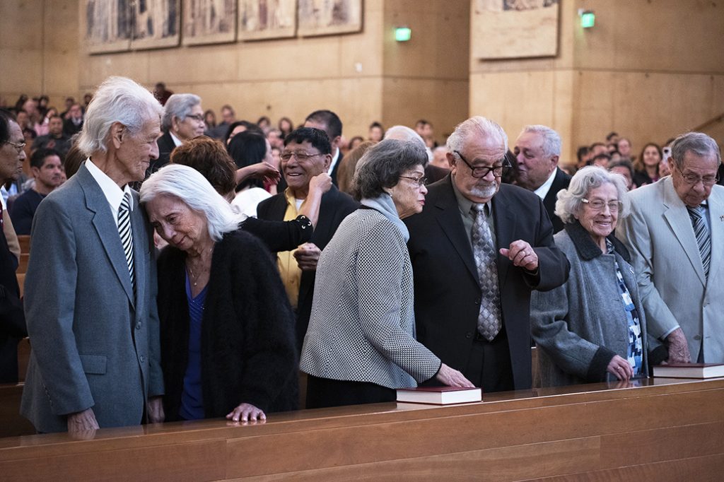 Alrededor de 50 parejas, que celebran 72, 50 ó 25 años de matrimonio, renovaron sus votos matrimoniales en las Misas del Día Mundial del Matrimonio en la Catedral de Nuestra Señora de los Ángeles.